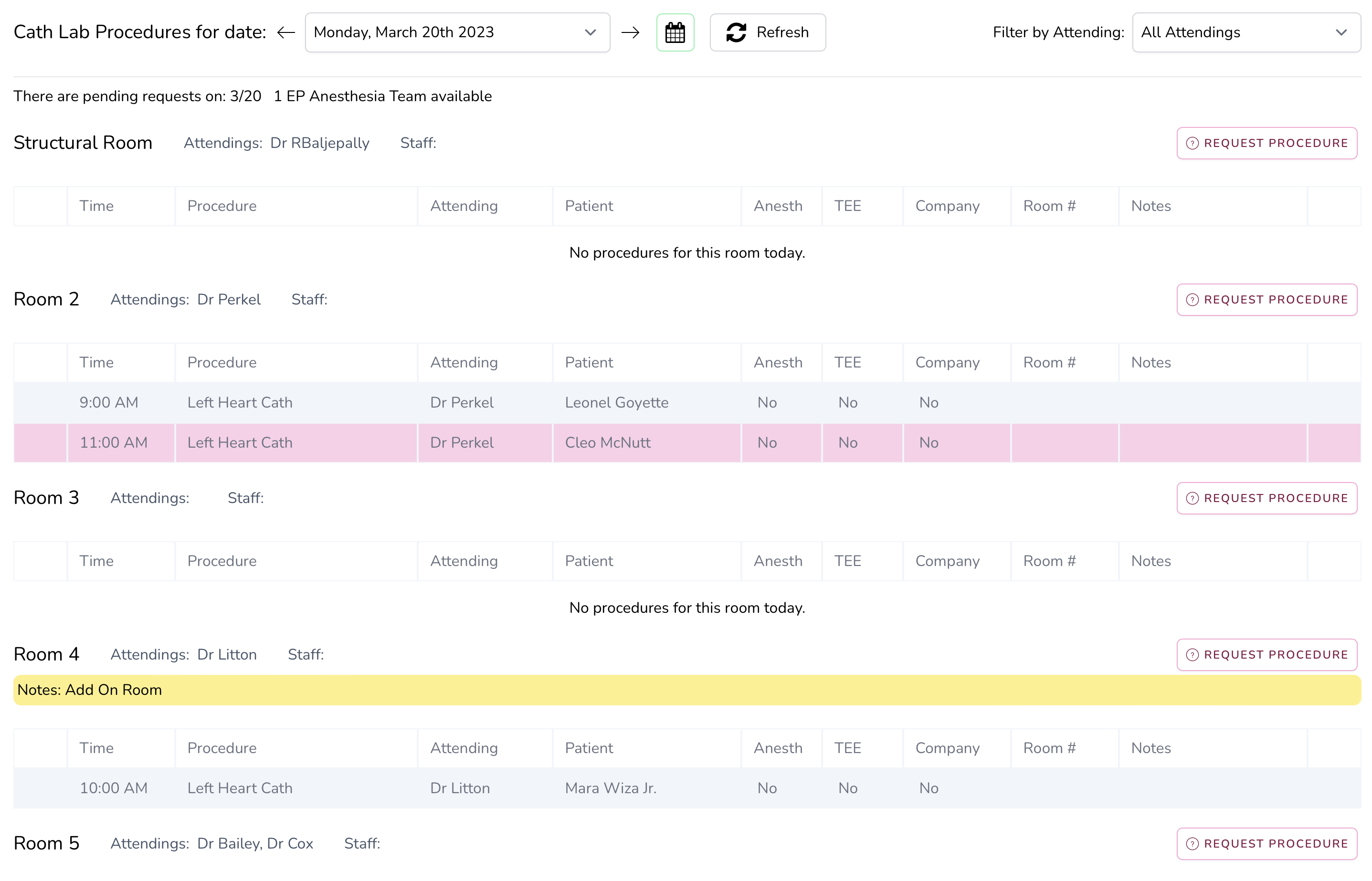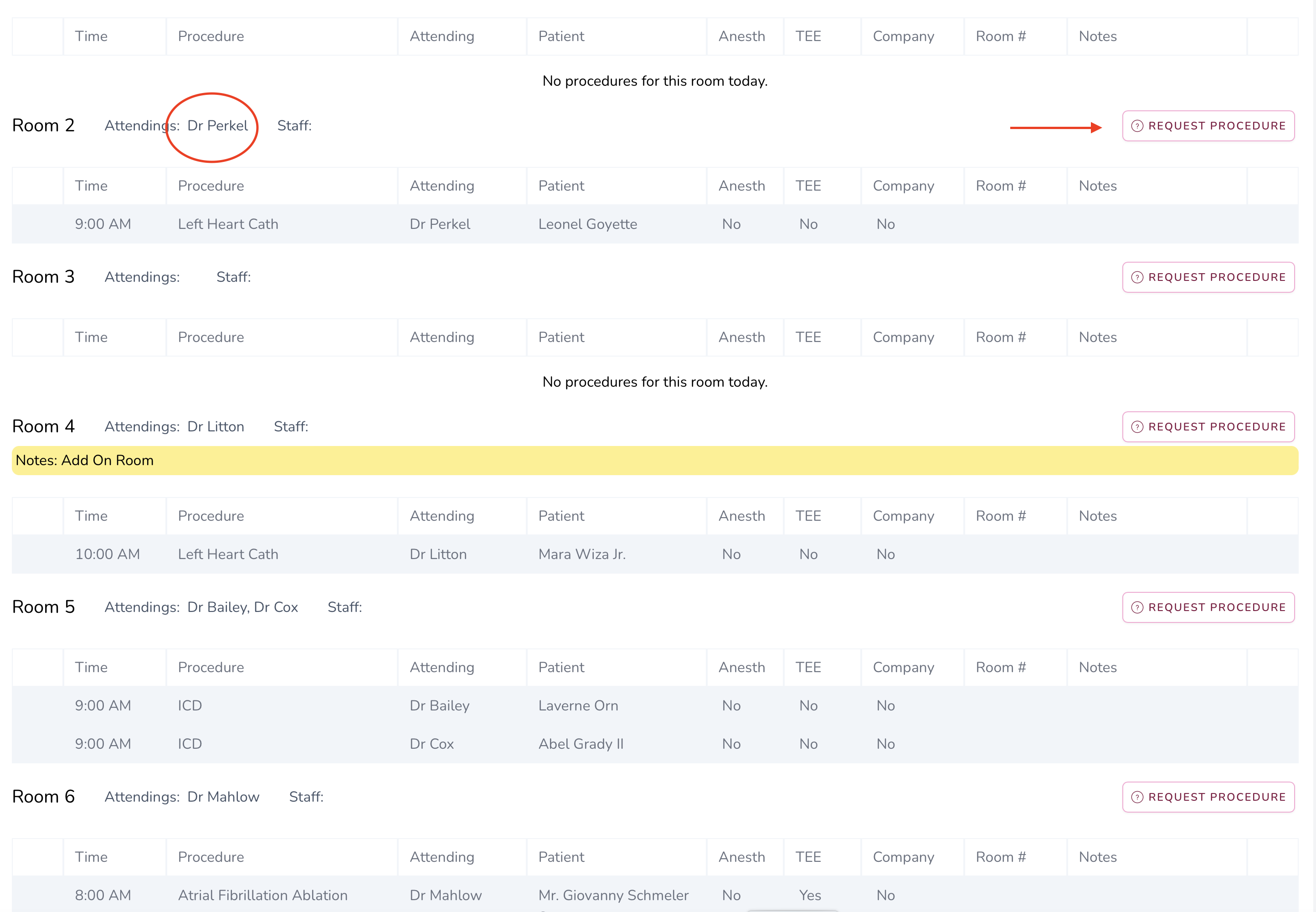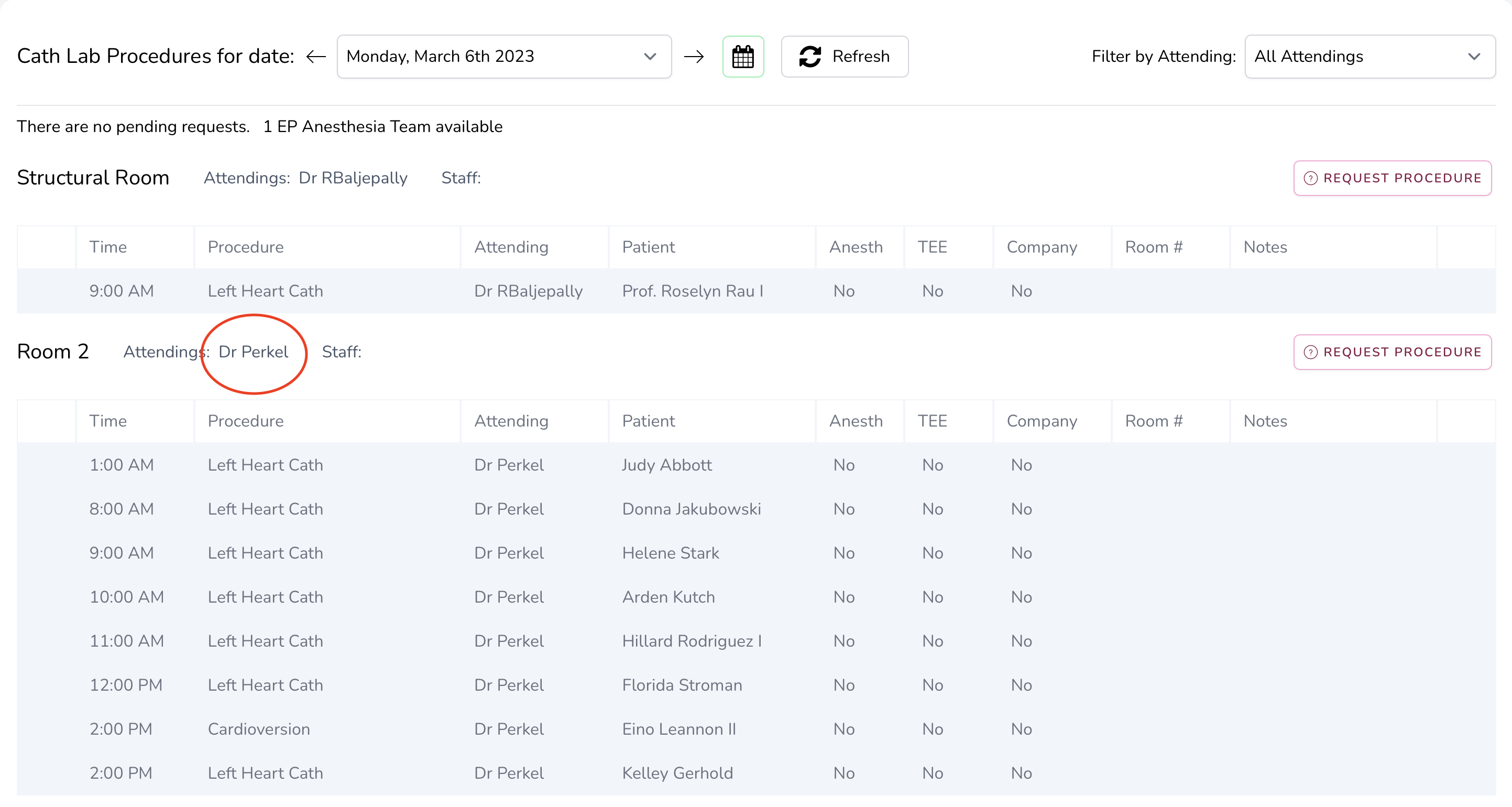 Great! Dr. Perkel only has one procedure in Room 2 at 9 AM. Let's make a request for his second cath of the day at 11 AM. Click the Request Procedure button. You can request procedures in any room, but try to choose the room that your attending has that day.