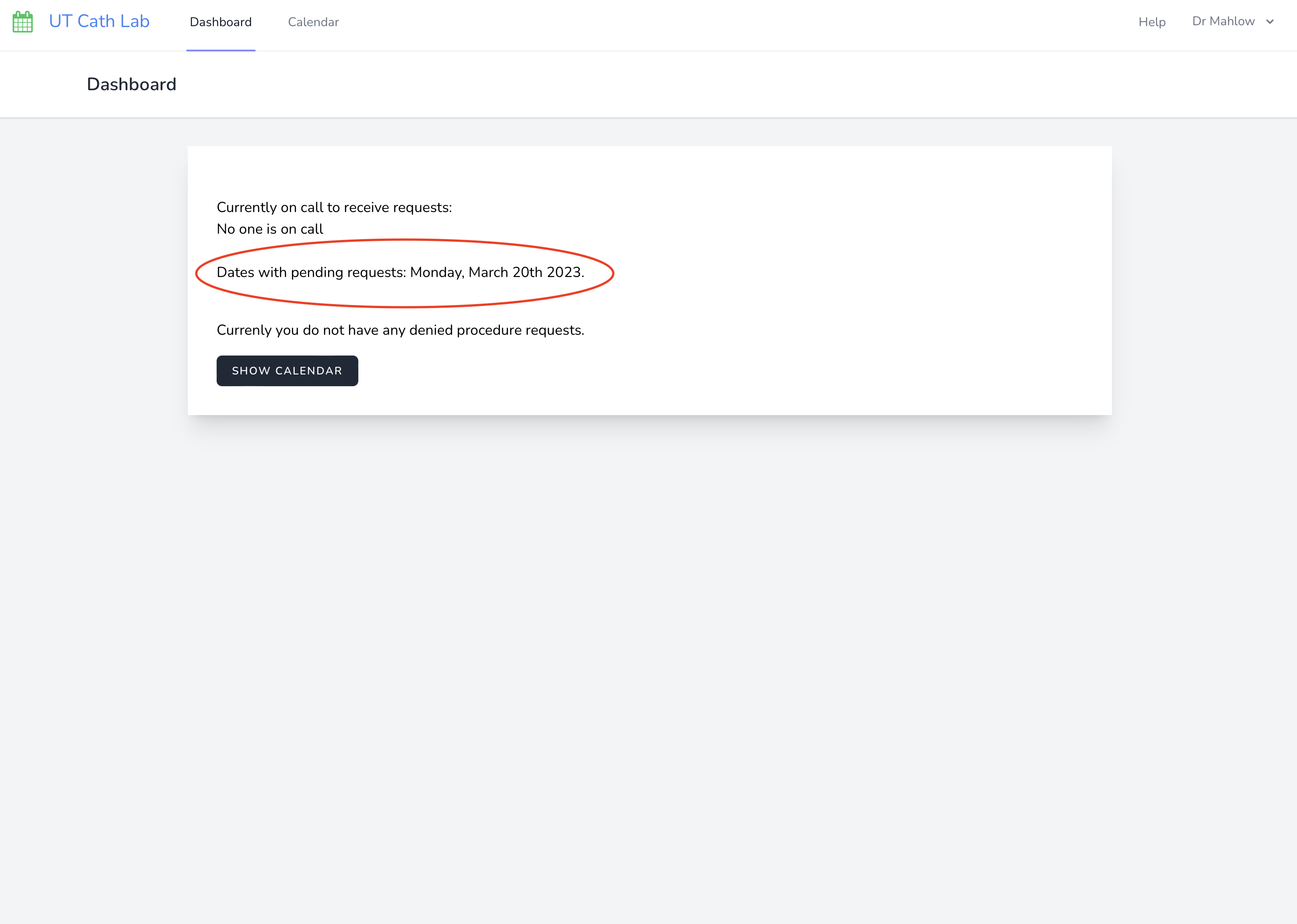 You can see that we added this request to the calendar and it is highlighted pink. Requests will remain pink until they are approved. You can always call 9064 to speak to Karen about procedure scheduling if there is a problem.