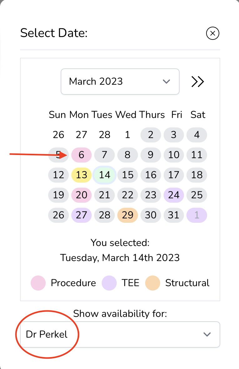 Make sure you have the right attending selected at the bottom of this window. The pink dates are when they are doing procedures, the orange are for structural days, and the purple ones are for TEE days.