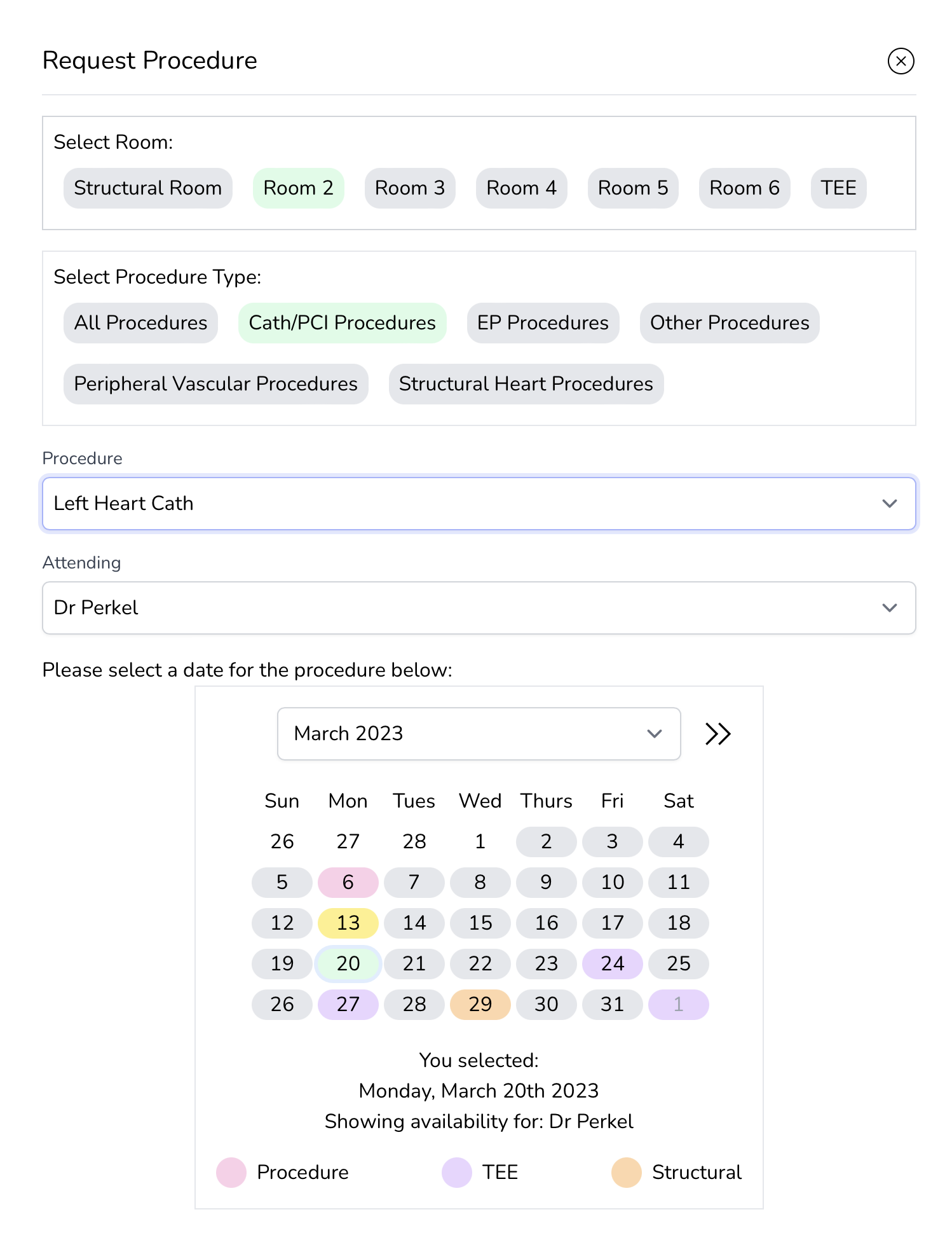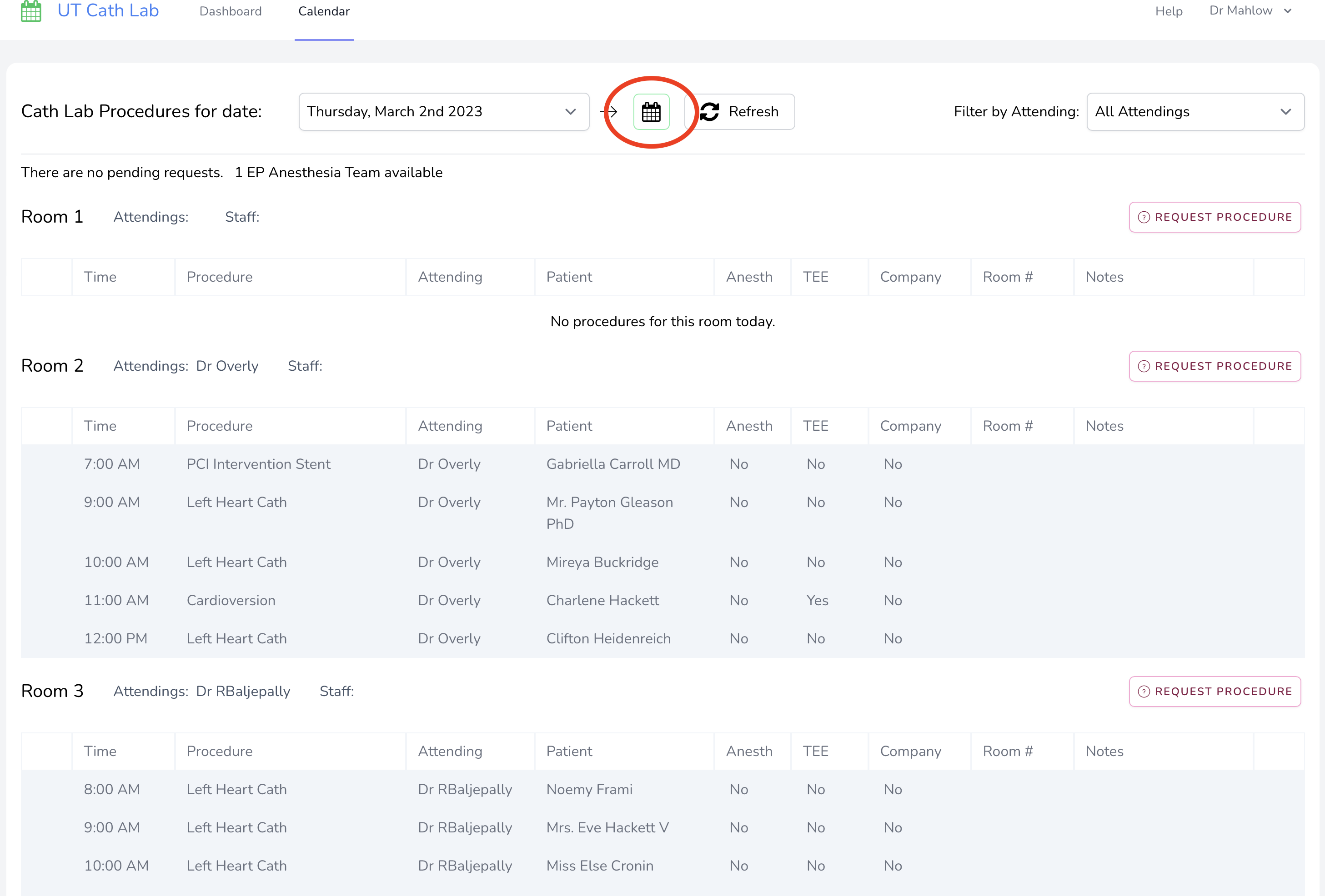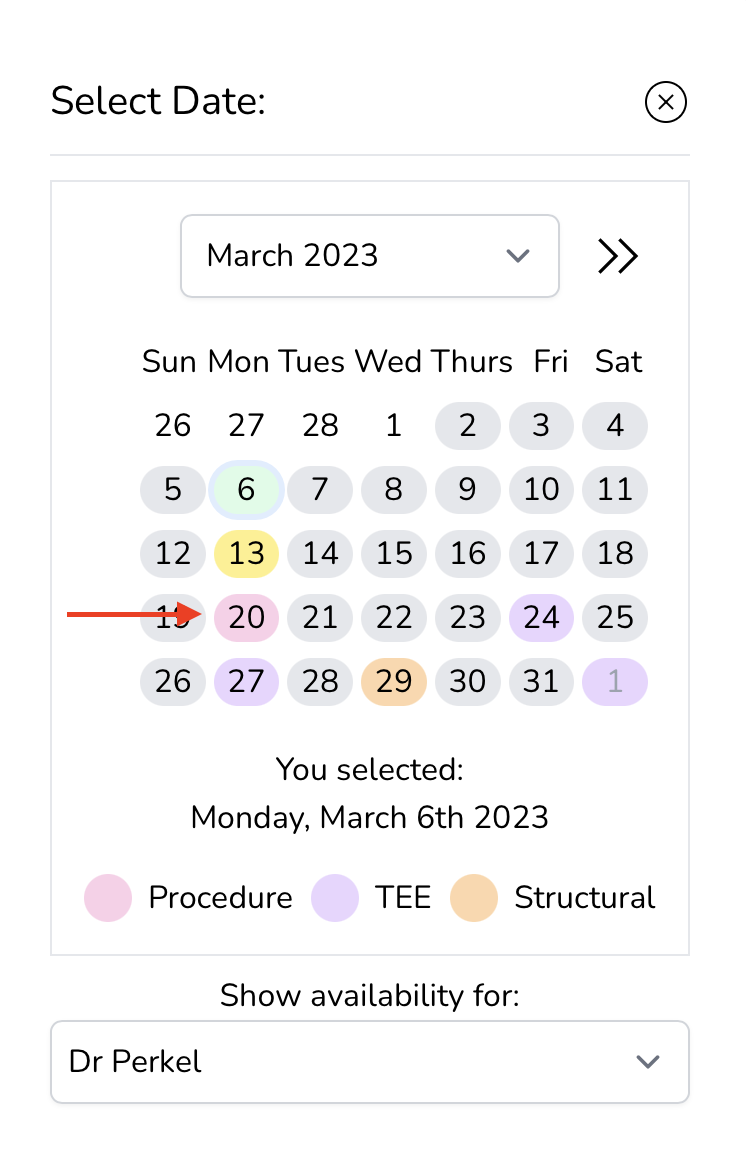 Dr. Perkel has a procedure day on March 6, so we selected that day. We can see that he has Room 2 that day. Uh oh! it looks like he is doing a lot of procedures already. Let's pick a different day. Click the little calendar icon again.