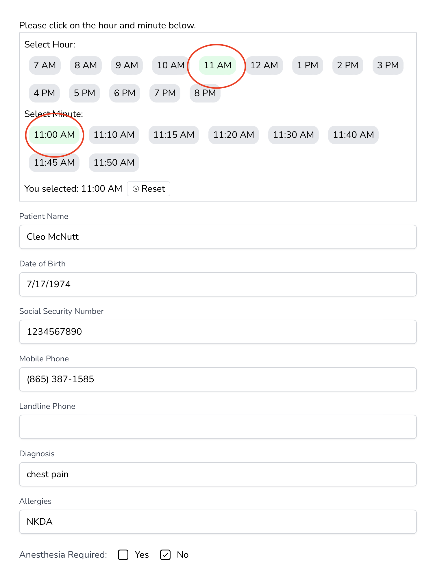 To select the time of the procedure, click on the hour at the top and then the minute on the second line. We are selecting 11 AM because he has a cath already at 9 AM.