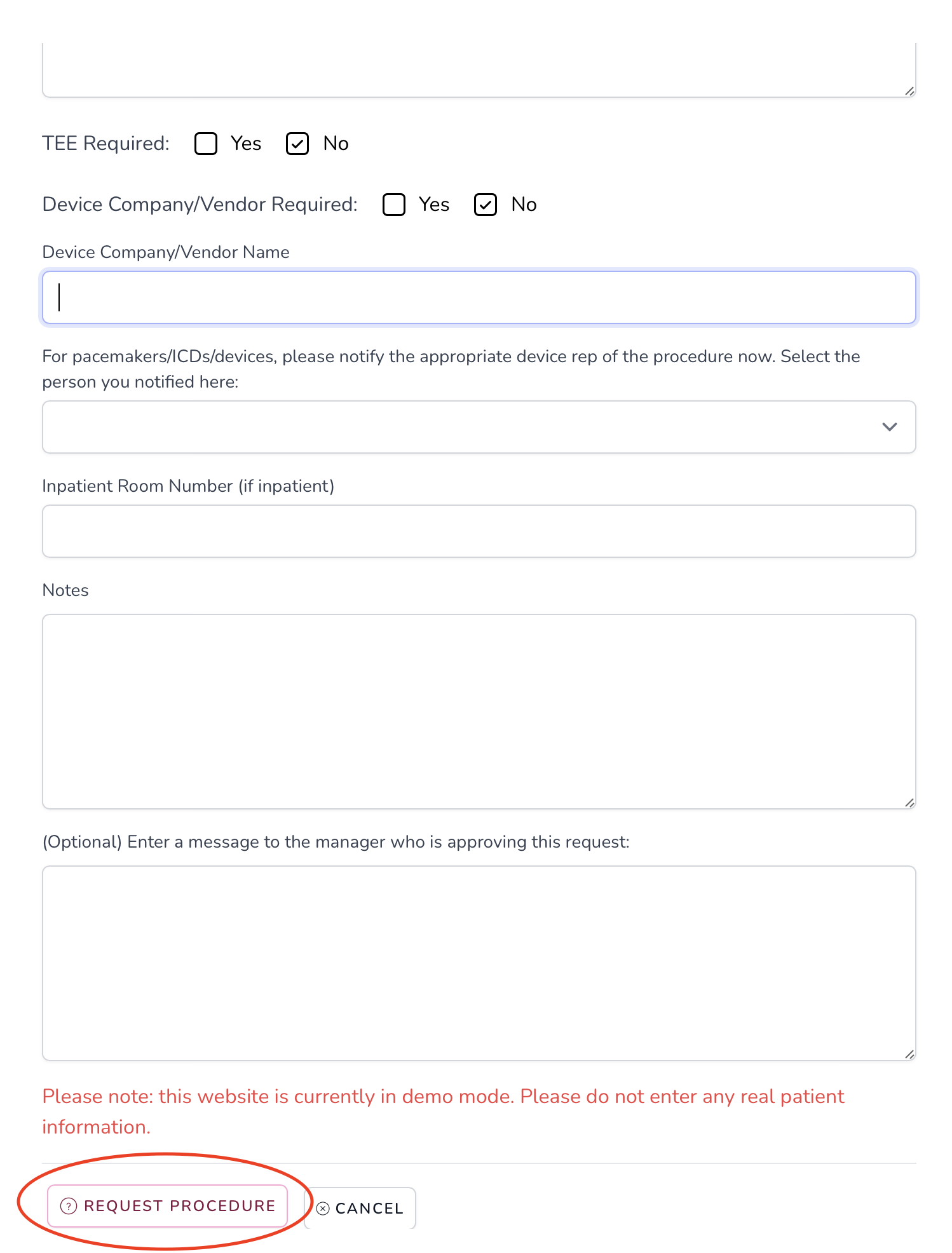 For some procedures like a pacemaker, you need to select a device company (Boston Scientific for example). You can attach the device rep to this procedure if you want. The device rep will get a text message when the procedure gets approved. You should also communicate with the device rep and tell them the patient name, etc., because their text message will only contain the time and date (not the patient name).