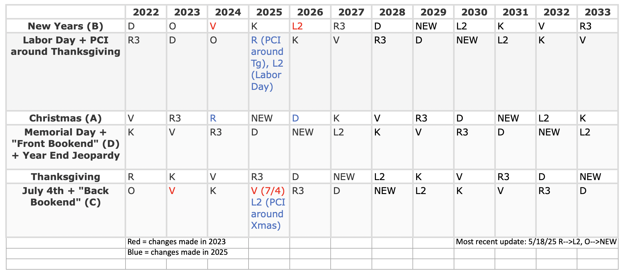 | Memorial Day/Labor Day | W/H2, W/C2 | I/V2 | J2/M4/P2 Memorial Day, J2/M4/H2 Labor Day | T/S/C3 | W/S2/S3 | L (can't do weekend)/P/P2 | I/G/E | J2/M4/H2 | |