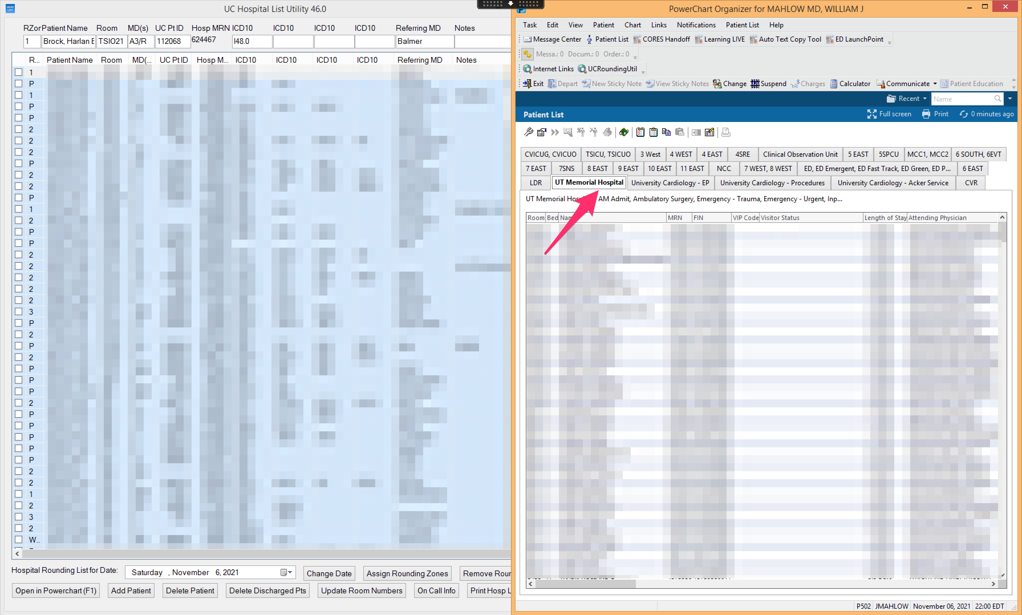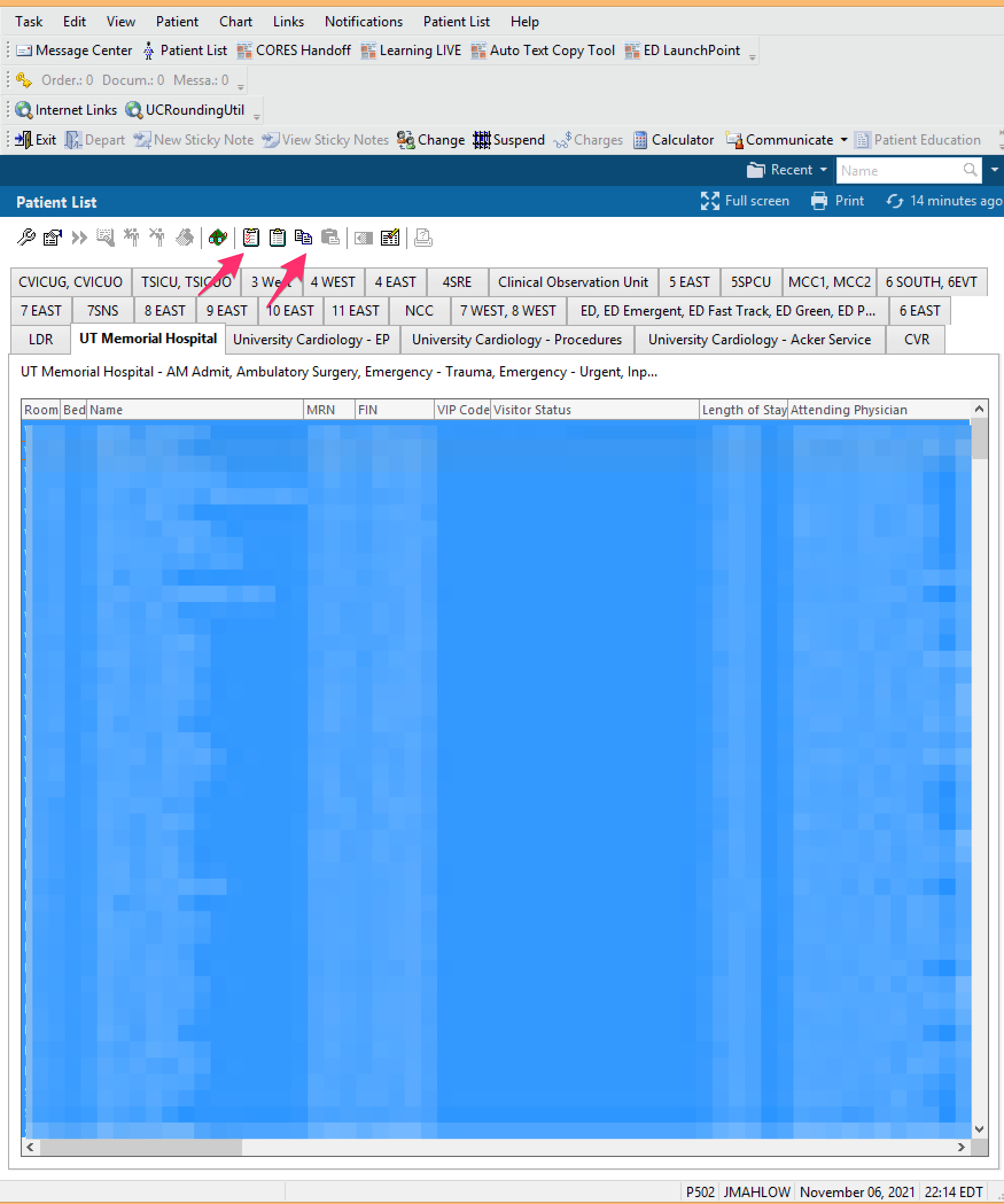 You will have to click on a patient in the PowerChart UT Master Hospital List, then click Ctrl-A to select all the patients, then click Ctrl-C to copy the information to the computer clipboard. There are also small buttons to select all patients and copy patients to the clipboard if you would rather click those buttons. The computer will pull data from the FOURTH COLUMN of this list in powerchart which should be the medical record number.