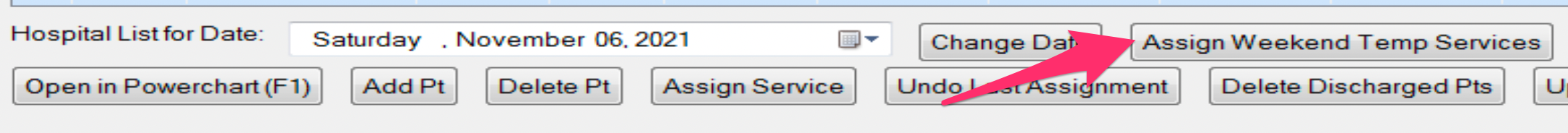 If today is Saturday or Sunday, click Assign Weekend Temp Services. This will make sure every patient is assigned to the Acker, London, Rawson, or Wortham service (at least temporarily) on the weekend. If today is Monday, click Remove Weekend Temp Services. Also remove any WP's (weekend pass) from the Service column on Monday.