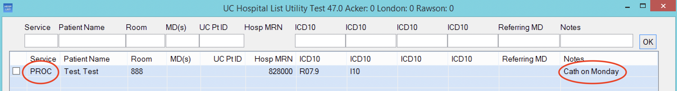 Open the UC Hospital List Utility. The FIRST STEP is to look through the hospital list and make sure everything looks OK. The only patients that should have PROC in the Service column are patients that are coming in for a cath or procedure in the future. If these future patients don't have PROC, then please add the PROC to the Service column (you can probably tell that they are a future patient by looking at the notes column- it will say something like Cath On Monday). ONLY ADD PROC if the patient is NOT in the hospital (they are coming in tomorrow or Monday). If the patient is CURRENTLY IN the hospital, remove the PROC and just leave it blank. Look over all the data in all the columns. On weekends, you might see a /CHF in the Service column, but if it is the weekday, someone may have meant to write /CHF in the Attendings column instead.