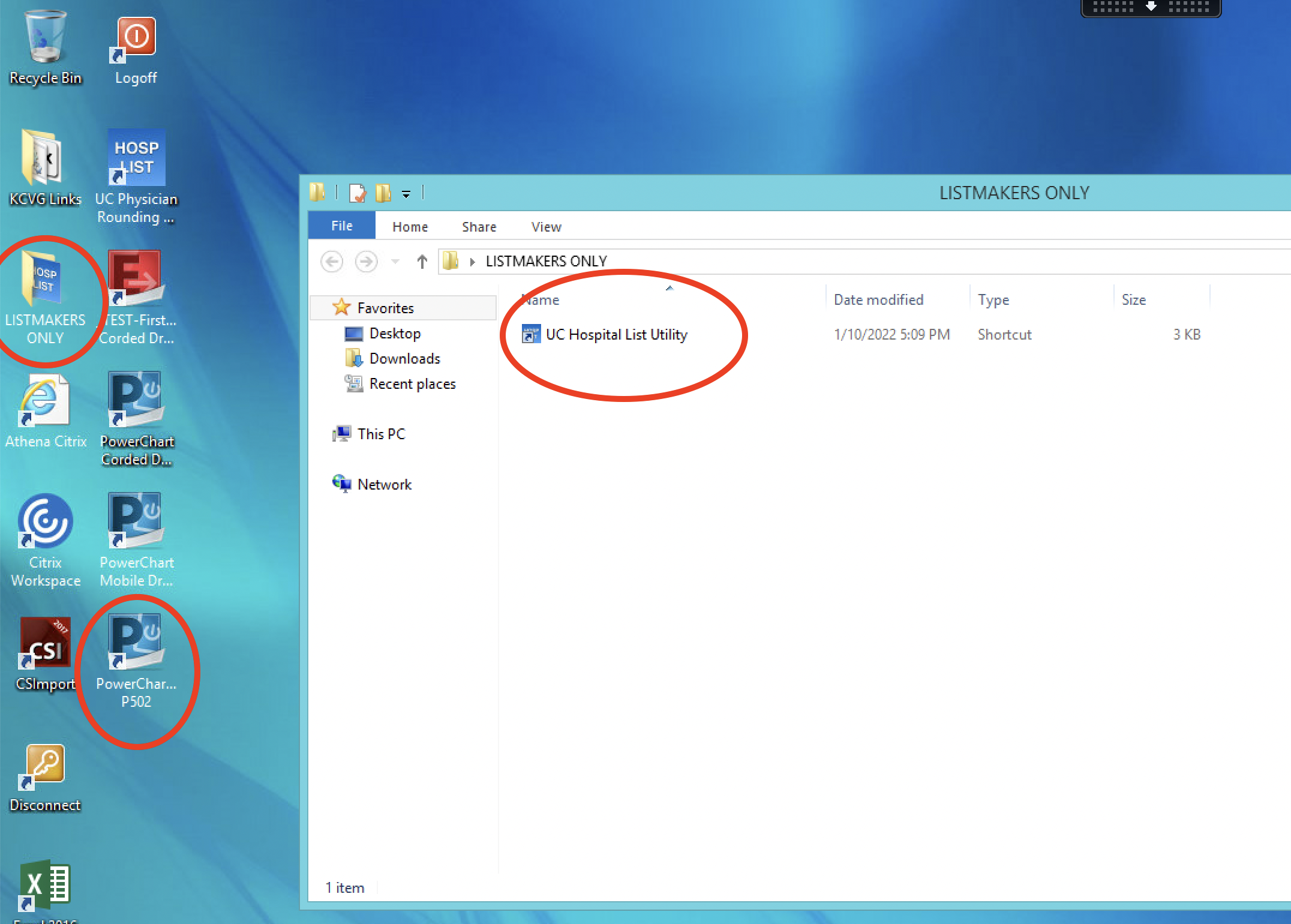 Open PowerChart and log in. On the GENERAL Virtual Desktop, go into the folder For Listmakers Only. The UC Hospital List Utility is inside this folder.