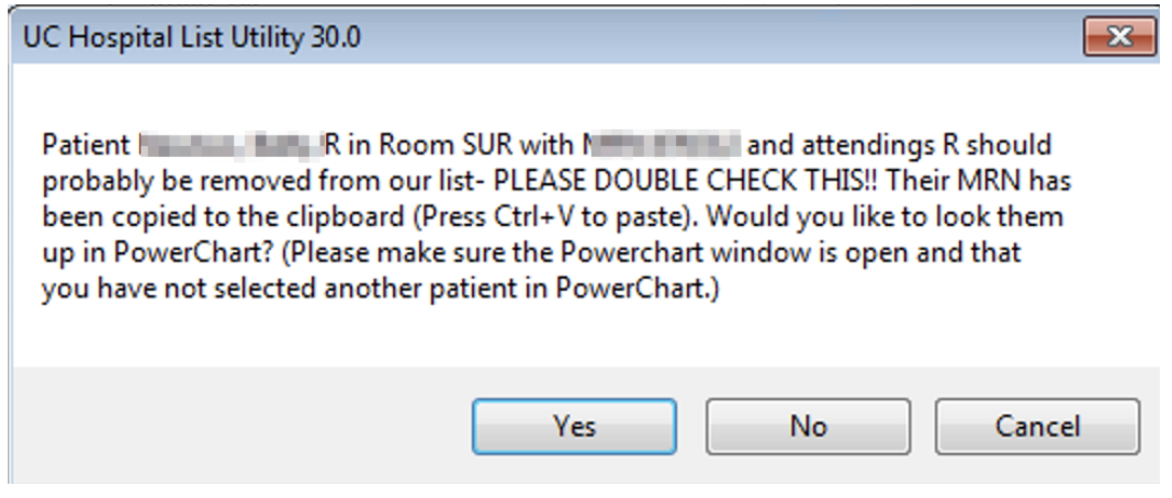 Pull up the master hospital list in PowerChart (UT Memorial Hospital) and make sure you have configured this correctly so that all of the patients in the hospital are on this list. MAKE SURE YOU ON ON THE CORRECT LIST- IT SHOULD SAY UT MEMORIAL HOSPITAL OR SOMETHING LIKE THAT. This is a list of all the patients that are in the hospital. If a patient is not on this list, that means they are not in the hospital.